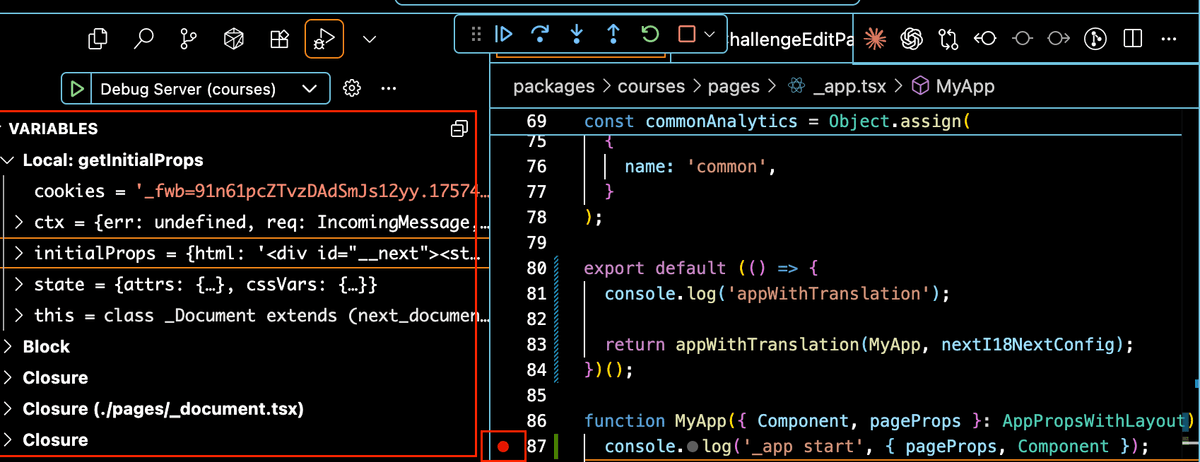 자 이제, 제가 겪은 서버 사이드 실행 순서를 쉽게 파악해 보겠습니다. 원하는 위치에서 중단점을 설정하고, Next.js가 어떤 순서로 코드를 실행하는지 명확하게 확인합니다.